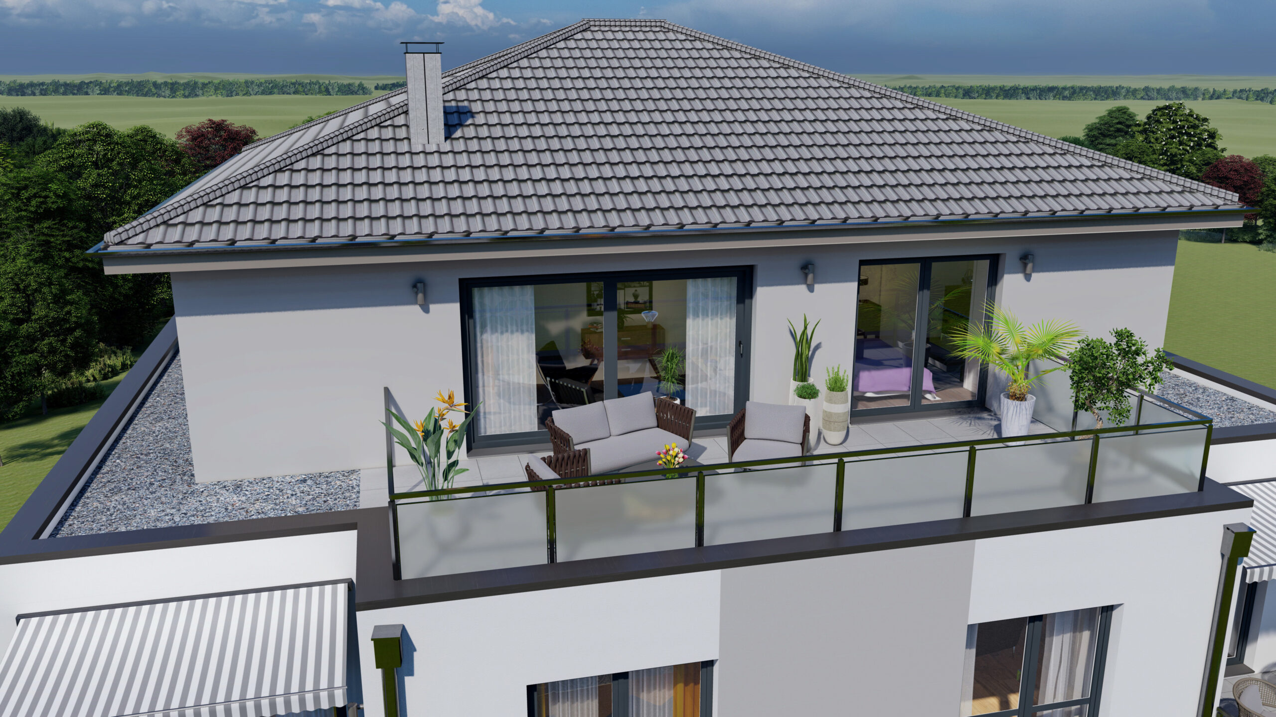 mit Edelstahlgeländer, blickdichtem Sicherheitsglas und frostsicherem Plattenbelag
